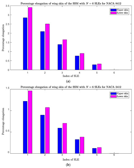 Percentage elongation of wing skin segments of the SSM with N = 6 SLEs for: (a) NACA 8412; (b) NACA 2412.