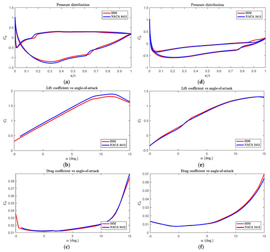 Comparison of the aerodynamic behavior of the surface formed by the proposed SSM with N = 6 SLEs at the position of the baseline airfoil morphed into NACA 8412: (a) pressure distribution; (b) lift coefficient vs. AoA; (c) drag coefficient vs. AoA; and the surface formed by the proposed SSM with N = 6 SLEs at the position of the baseline airfoil morphed into NACA 2412: (d) pressure distribution; (e) lift coefficient vs. AoA; (f) drag coefficient.