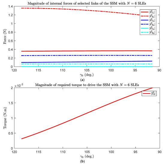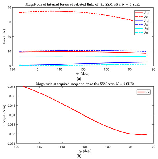 (a) Magnitude of internal forces of selected links of the SSM and (b) Magnitude of required torque to drive the SSM with N = 6 SLEs for NACA 8412.