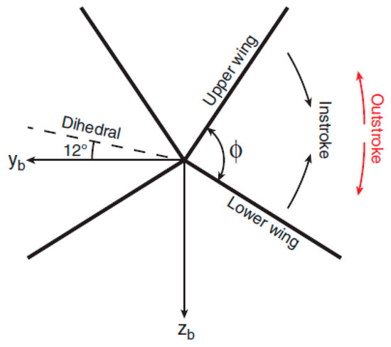 The DelFly MAV is a four-wing flapping MAV with wing pairs on either side of the vehicle that are set at a dihedral angle of 12° and actuated in counter-phase (see Figure 1 and Figure 2). The total wing span is 280 mm and the maximum stroke angle ϕ is 87°. The wings are constructed from 15 µm thick transparent Mylar foil, with carbon-fiber leading edge spars and wing stiffeners completing the wing structure. The leading edge spars are driven by a single motor through a gear-pushrod mechanism (see Figure 1) in a periodic, quasi-sinusoidal flapping motion, during which the wing surfaces undergo appreciable passive deformation [14,19]. Figure 2 defines the wing kinematics nomenclature based on the leading edge motion, with the outstroke being the phase in the flapping cycle where the wings move away from each other, and the instroke being the phase where they move towards each other. It is to be remarked that because of the wing flexibility, the wing surface motion displays an appreciable delay with respect to that of the driven leading edge. As a result, when the wings meet at the transition from the instroke to the outstroke, a so-called “clap-and-peel” occurs: as the wing leading edges move away from each other again, the wing surfaces only gradually come apart as the outstroke progresses. This is indeed clearly visible in the flow visualizations discussed in Section 3.1.