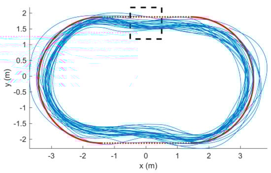 The DelFly vehicle was programmed to follow an oval trajectory, consisting of two half circles of 4 m in diameter, with two approximately 3 m long straight segments in between (see Figure 3). The guidance algorithm uses a “carrot” waypoint that the vehicle tries to reach. This waypoint is placed at a fixed distance in front of the vehicle on the desired flight path, and is advanced at every time step of the control loop to keep its distance from the vehicle constant. Despite the relatively sharp turns, this strategy results in repeatable trajectories that remain close to the desired path (Figure 3). The spread in the lateral direction was comparable to the wingspan of the vehicle, which enabled reliable repeated traversal of the 1 m wide test area. The accuracy of the height control was below 2.5 cm at optimum tracking conditions, which corresponds to about 10% of the wing span.