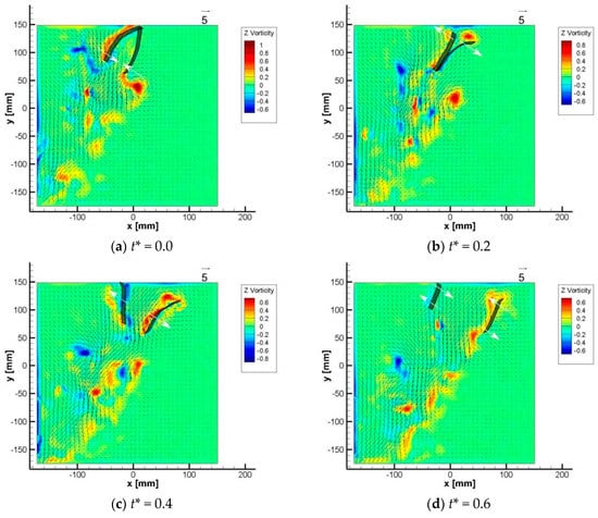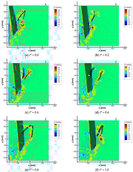 The position and cross-sectional shape of the two wings are clearly visible, and reflect the advancement of the MAV in the flight direction (i.e., towards the right) as time progresses. In the shaded region, the illumination is obstructed by the horizontal tail surface, which prevents meaningful measurements to be performed in that area. The white arrows have been inserted to indicate the relative motion of the wings with respect to each other, and it can be seen that shortly after stroke reversal, the wing flexibility results in an apparent rotation of the wings, with the wing LE and TE moving in opposite directions (see t* = 0.6, a similar behavior occurs near t* = 0.1). Also, in the early phase of the outstroke (see t* = 0.2) the visualization gives clear evidence of the “clap-and-peel” effect [14,19], where the rear part of the wings remain connected during much of the initial phase of the outstroke. As soon as the peel ends and the wing gap is opened, a strong downward flow between the wings is established, as can be seen at t* = 0.4, and which is maintained until the end of the instroke phase, see t* = 0.8.