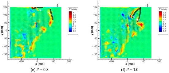 Results are presented for one of the recordings where the MAV enters the field-of-view approximately at beginning of the outstroke (t* = 0), while at the end of the instroke (t* = 1) the MAV has crossed the light sheet, such that only the tail is illuminated. This has as a clear implication that the recordings at t* = 0 and t* = 1 are likely not to give identical flow patterns, in contrast to the streamwise flow visualization strategy (compare Figure 6a to Figure 6f, for example).