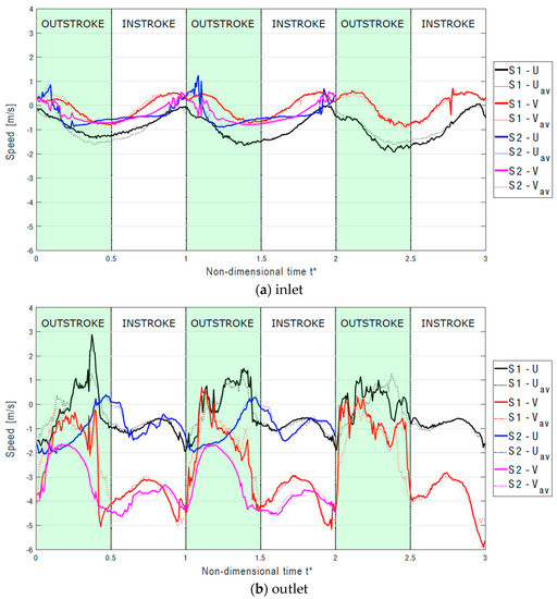 Figure 8 shows the results for the flow velocity components at these two monitoring positions for the available full flapping cycles for each experiment (three cycles for S1 and two cycles for S2), with the datasets synchronized at t* = 0 for the onset of the outstroke. The positive directions for U and V are to the right and upward, respectively, in accordance to Figure 6 and Figure 7. The solid lines indicate the actual variations over the individual cycles, while the dashed lines represent phase-averaged results, which allows us to verify the periodicity of the results. The higher level of fluctuations for S1 are attributed to the circumstance that at this inboard location the disturbing effect of the wing reflections is larger than for the outboard location S2 due to the closer proximity of the wings and the wing deformations.