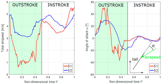 where U av and V av are the flow velocity components at the outlet position (as in Figure 8b), while U MAV and θ MAV are the flight speed and pitch angle of the MAV. The results for Q T and α T are given in Figure 9. Note that the S2 position (at 63% semi-wing span) corresponds approximately to the tip of the horizontal tail surface (which is at 61% of the semi-wing span), whereas the S1 position (at 45% semi-wing span) corresponds to approximately 75% of the tail semi-span. It is observed that over most of the flapping cycle, the absolute airspeed is quite high (between 3 and 5 m/s) compared to the flight speed (~1 m/s). For reference, this may be compared to the mean wing tip speed (~5 m/s) or the average induced speed estimated from actuator disk theory (which is ca. 2.7 m/s). From the results shown in Figure 9, it is observed that during the outstroke, the angle of attack is first positive and then negative; however, the airspeed remains relatively low during the outstroke. During the instroke, on the other hand, the airspeed is high, yet the angle of attack remains near zero.
