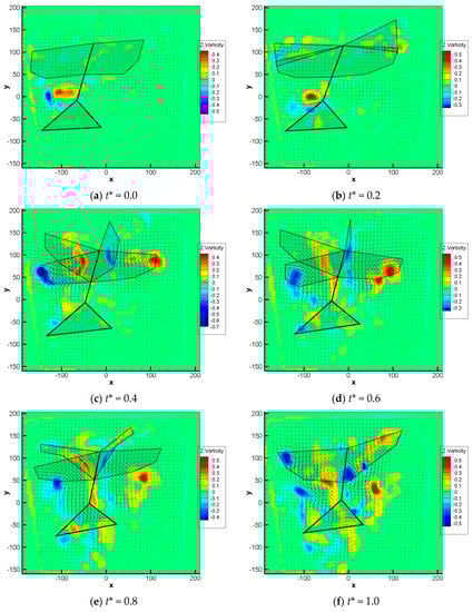 At t* = 0 (Figure 10a), two counter-rotating vortical structures can be seen which would appear to be created shortly before this moment, and which decay in the subsequent phases. Their origin is not directly obvious, also in view of the fact that similar structures do not always occur in the same form in other recordings, which leads to the assumption that they are in some way connected to the asymmetric flight path in this case. During the outstroke (see Figure 10b,c), prominent counter-rotating vortices are generated at the tips of the lower wings, which remain visible in the measurement plane during the whole remainder of the visualization cycle while the DelFly proceeds forward. This is directly indicative that during the outstroke, the lower wings are actively generating lift (which supports the statement made in Section 3.1), while the upper wings are relatively inactive in this respect. It is only towards the end of the instroke (Figure 10f) that tip vortices generated by the upper wings become clearly visible. The orientation of the vortices is the same as that previously observed for the lower wings during the outstroke, which confirms that during the instroke, only the upper wings are generating lift. At the same time, counter-rotating vortices are visible near the wing roots. The most likely explanation for why similar root vortices are not generated during the outstroke is that due to the clap-and-peel, the wings separate only gradually, which suppresses vortex formation especially near the root region. Throughout most of the flapping cycle, small scale vortical structures can be seen in the region near the tail, however, it is not clear if these are indeed related to vibrations of the tail or substructures within the wing wake.