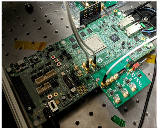 The avalanche photodiode (APD), as seen in Figure 9, is responsible for detecting the 1531 nm optical pulses, and outputting the electrical pulses quickly and efficiently to be time stamped by the time-to-digital converter. The current APD is a Voxtel RIP1 series free-space InGaAs detector (Voxtel, Inc., Beaverton, OR, USA), with a 200 active element and a transimpedance amplifier integrated within the housing to reduce noise and retain its 1 GHz bandwidth. Utilizing two programmable gain amplifiers (PGA) in series, the 30 mm × 30 mm board can perform over a dynamic range of 60 dB while only consuming about 1 W. The APD board interfaces directly with a Raspberry Pi (emulating an FPGA board) via Serial Peripheral Interface (SPI), as well as with a daughter board via AC coupled SubMiniature version A (SMA) cables, which, using a comparator with a digital-to-analog converter configured threshold, sends a digital pulse to the time-to-digital converter board.