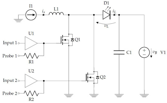 The circuit was designed to pulse a laser (D1) at 50 MHz with up to 500 mA of current (from I1). The threshold current to emit light from the selected laser is 50 mA. The design of FLASHE keeps the current just below the population inversion threshold in between pulses, and jumps above the threshold when emitting light. The negative bias voltage (V1) at the cathode of the laser enables the voltage across the laser to be just below the threshold value. The application of a constant bias reduces the amount of voltage change required to pulse, therefore reducing the rise time. Particular attention was given to decoupling the laser bias to ensure that the bias voltage supply conserved a low impedance at high frequencies. Very low impedance capacitors (C1) have been incorporated to maintain an impedance below 1 Ohm up to 10 GHz.