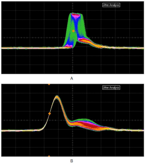 (A) 100 ps pulses aligned to the reference clock, 200 ps per division; (B) 100 ps pulses self-triggered, 100 ps per division [12].
