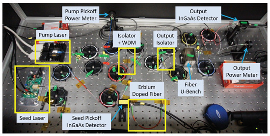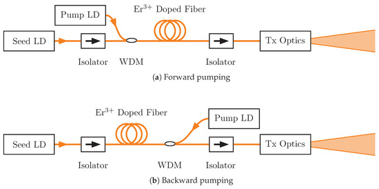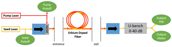 The optical amplifier is responsible for amplifying the 1.5 seed laser pulses to a high enough peak power in order to be detected by the distant receiver. For MOCT, the optical amplifier is an erbium doped fiber amplifier (EDFA) in a master oscillator power fiber amplifier (MOPFA) configuration. The continuous wave (CW) ∼980 nm pump laser is coupled with the erbium doped fiber and stores energy via stimulated absorption with the erbium ions. When the seed laser pulse is emitted into the erbium doped fiber that has energy stored in the erbium ions, the seed laser pulse is amplified via stimulated emission. The gain from the EDFA is controlled by how much pump power is coupled into the fiber and how long the erbium doped fiber is charged between seed pulses. In general, higher pump powers and a longer time between pulses are associated with higher amplification (within some physical limitations of the particular amplifier) than lower pump powers and a shorter time between pulses. One characteristic of EDFAs is that they are able to amplify pulses with very little temporal distortions on the original seed pulse.
