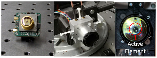 The left picture shows the NOVA receiver board used in laboratory testing. The center picture is the NOVA receiver board inside of its housing for both thermal dissipation and positioning of the focusing lens. The right photo is looking at the active element through the focusing lens which increased the APD effective active area size from 200 to ∼5 mm. The focusing lens was aligned to this magnification (∼25×) in order to have an effective active area larger than the 3.6 mm collimated amplifier output signal and maintain low laboratory alignment requirements.