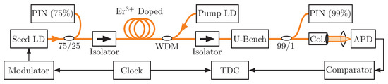 The goal of the amplifier verification test was to demonstrate the benchtop amplifier’s capabilities in a configuration similar to the MOCT amplifier design and compare the measured performance with expected performance produced from the optical amplifier simulation. First, the efficiency of the pump laser being injected into the erbium doped fiber was measured to be 72.9%. Second, the efficiency of the 1531 nm signal from the exit of the erbium doped fiber to the output PIN was estimated, after combining a series of measurements, to be 56.5% with no added attenuation on the U-Bench. The fibers were then connected back together and the test was conducted. For this experiment, the collimator, APD, comparator, and TDC were the only components in Figure 12 that were not used.