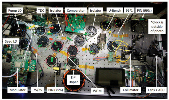 The MOCT laboratory hardware incorporates the same components as the MOCT space hardware, which includes the modulator, pulse driver, optical amplifier, APD, and TDC. These components are in a modular configuration that allows component performance to be assessed both individually and in groups. The MOCT hardware on a satellite can be designed to fit in a nanosatellite package, while the modular connections on the laboratory hardware, needed to evaluate components individually, would be eliminated to increase efficiency for volume, weight, optical transmission.