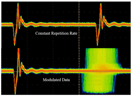 The oscilloscope reading is shown for the negative APD output signal. Two fast frame measurements are shown to visualize the difference between a non-modulated signal and a modulated signal. On the modulated fast frame capture, 2000 frames are shown within the single image and triggered off of a random pulse within the transmitted data. This shows the range of relative pulse positions for the data string.