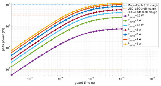 By using Equation (1) and constraining the receiver peak power to be 200 nW (100 nW with 3 dB margin), the required transmitter peak power was calculated for each link scenario. The required transmitter peak power can be seen in Table 1 with the selected transmitter and receiver sizes used in the link scenario. The maximum required transmitter peak power and design goal for MOCT is 1 kW. Additional detail on the optical link parameters, terms, and equations used for the MOCT link senarios can be found in Appendix A.1.