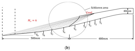 Figure 2, T1–T9). The signals were acquired at a sampling rate of 10 kHz using data acquisition cards with a sampling time of 10 s, which covers the entire run time of the wind tunnel. Along with pressure measurement, a Schlieren visualization system was used to obtain the flow characteristics. The Schlieren system used a combination of a light source, optical devices and a camera in a typical Z-type set-up. A NAC (NAC Image Technology, Minato-ku, Tokyo, Japan) Hotshot High Speed Camera operated at a frame rate of 5 kHz and a resolution of 600×438 pixels was employed.