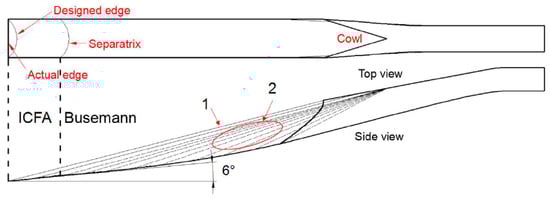 Figure 3 are on the symmetrical plane of the inlet). Both the designed leading edge and the separatrix between the ICFA and the Busemann flow fields are curved; however, to match the vehicle’s body design, the curved leading edge is replaced by a straight edge in the actual test model. The total contraction ratio of this model is 5.095, and that of the internal contraction ratio is 2.171.