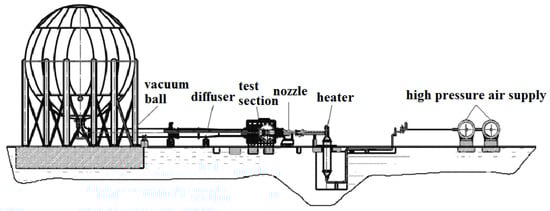 3) downstream from the test section and diffuser. The experiments can be conducted with 0.04–1.0 MPa total pressures, 288–685 K plenum temperatures, and 6.47 × 10