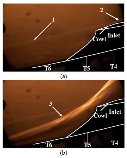 Figure 6. There are significant differences between the started and unstarted flow field. In the started state, the leading-edge shock 1 was straight and close to the cowl; the cowl shock 2 was visible and steady. When the state switched to unstarted from the high throttling level (