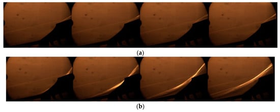 Figure 7b shows the pictures of ‘big buzz’ during one cycle, and the structure of the flow field changing dramatically with an obvious periodic characteristic. Although the inner portion of the inlet flow field cannot be seen due to the restricted size of optical access, the characteristics of the unstarted separation shock oscillation can be analyzed using image quantization.
