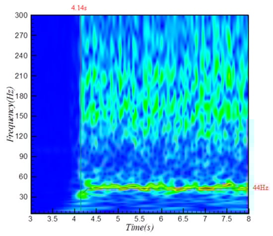 t = 4.14 s, corresponds to the occurrence of the shock oscillation. Then, a small increase to 44 Hz of the frequency can be seen, while it remains stable after