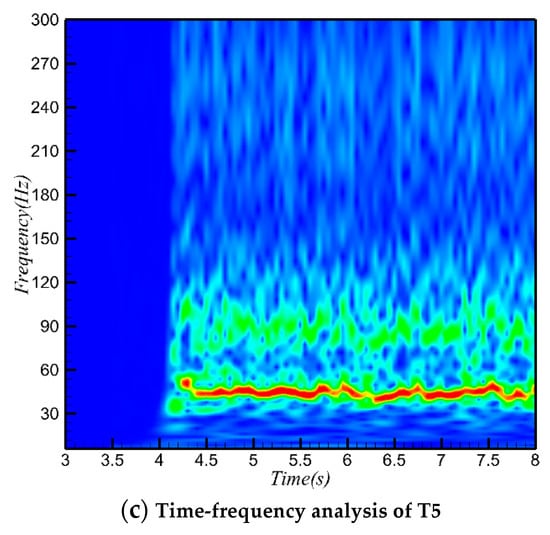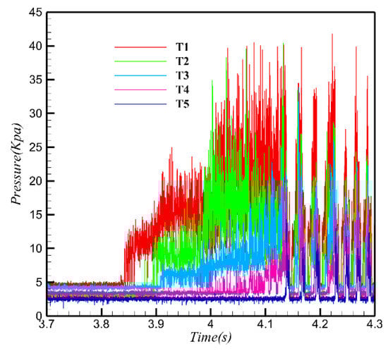 Figure 12 depicts the pressure time history of four typical survey points (T2–T5). The pressure time history of T2 (