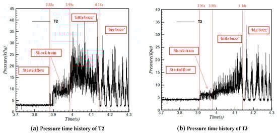 Figure 12a) was analyzed, and it was found that it can be divided into three consecutive stages. In stage 1, before t = 3.88 s, the pressure data remained nearly stable, indicating a started flow field. In stage 2, between3.88 s and 3.99 s, a secondary amplitude appeared, which was caused by the shock train in the internal portion of the inlet sweeping along the transducers. In stage 3, from 3.99 to 4.14 s, the pressure changed in a fluctuation with a larger amplitude, which indicates a ‘little buzz’. In this stage, the flow field was switched to the unstarted state. In stage 4, after 4.14 s, the pressure fluctuation becomes more intense and periodic with larger amplitude. The pressure is now unsteady indicating the appearance of a ‘big buzz’. The pressure time history of T3 (