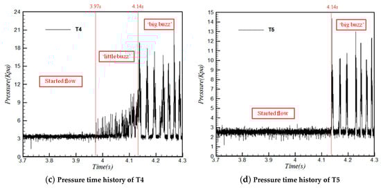 Figure 12d, T5 senses the ‘big buzz’ after t = 4.14 s but without capturing the ‘little buzz’. From the above analysis, the transducers located before T4, which is closer to the cowl, can be used to predict the unstarted flow field.