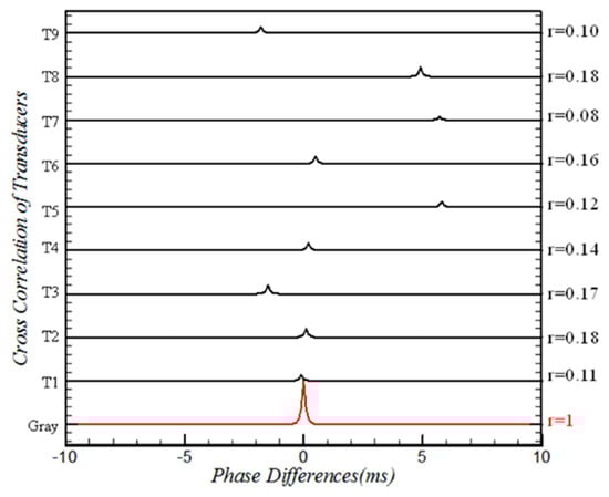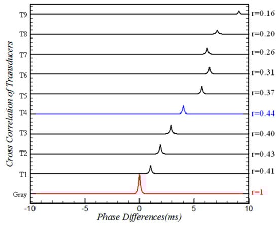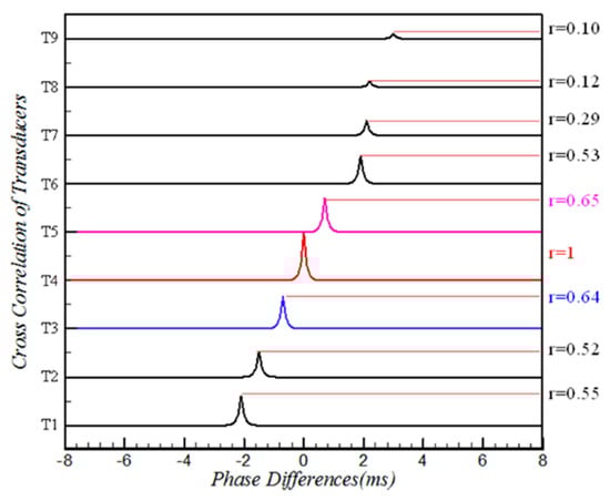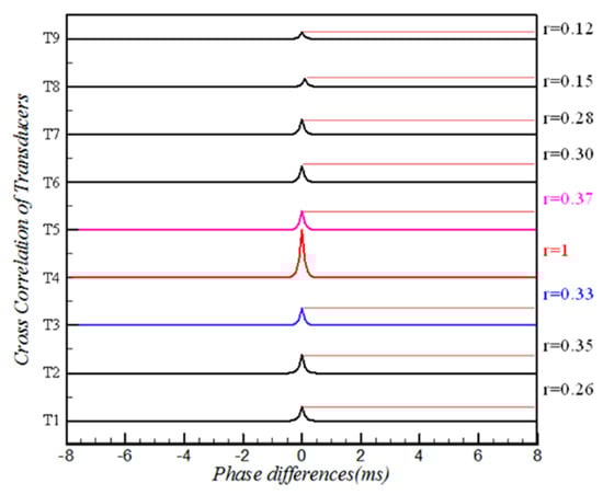 Figure 14 shows the time-phase analysis of the nine transducers based on the T4 signal; there were no phase differences at
