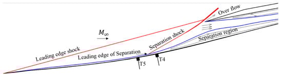 Figure 17 shows a strong correlation between the shock oscillation and the pressure fluctuation of T4 signal. Therefore, the location of T4 was more sensitive to the leading edge of separation shock when the little buzz appeared. The schematic of the flow pattern, shown in