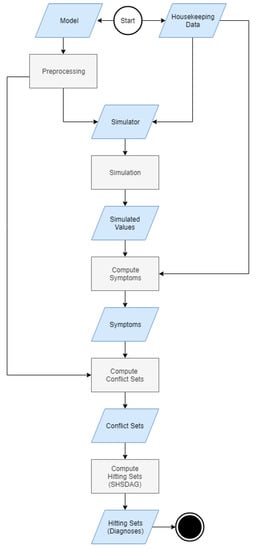 The approach that was employed in this paper is that of quantitative model-based diagnosis, with the main principles following the qualitative approach of [,] and implemented in Java. For quantitative model-based diagnosis, a quantitative model of the physical system is built, which captures its nominal behavior. The model is preprocessed and then loaded into the simulation environment. Parts of the housekeeping data are then used to simulate the model, to obtain simulated values, and therefore the expected behavior of the spacecraft. After the simulation has been performed, the simulated values are compared to the measured values from the housekeeping data and discrepancies are detected. Each discrepancy is called a symptom. These symptoms are then used to compute so-called conflict sets. These are sets of components on which the corresponding symptom components are dependent. In a qualitative fashion, the malfunction of one component from the conflict set explains the associated symptom components abnormal behavior. Finally, the minimal hitting sets are computed. A minimal hitting set is a minimal set of components, such that it contains at least one component from every conflict set. Therefore, each hitting set explains all symptoms. Each minimal hitting set corresponds to one diagnosis.