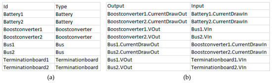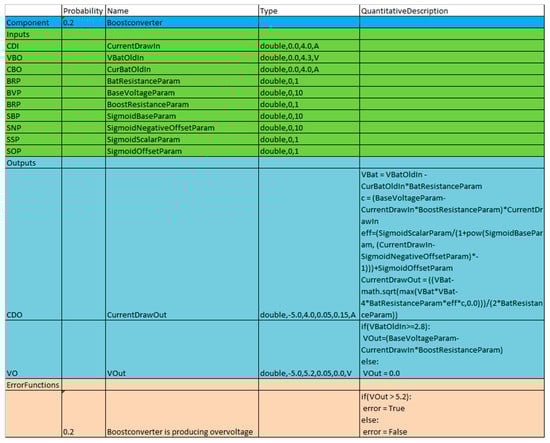 Figure 4 shows an example component class definition of a boost converter with an a priori failure probability of 0.2. There are 10 inputs and two outputs defined, e.g., the output port “CurrentDrawOut” with the abbreviated name “CDO” is parametrized with datatype double, a lower threshold of 0.0, an upper threshold of 4.0, a relative tolerance interval of 0.05, an absolute tolerance interval of 0.15, unit “A”, and a quantitative description. The abbreviated name “CDO” is later displayed in the model graph, next to the respective port of the instances of the Boostconverter component class. The defined error function has a probability of 0.2, a descriptive text, and a quantitative description, defining if the respective error is present or not. In this case, it checks whether the output voltage of the Boostconverter is higher than 5.2 V. If this is the case, the Boostconverter is producing overvoltage and the special variable “error” is set to true, meaning that the described error is present; or else, it is set to false. No meaningful direct comparison between simulated and measured values can be performed without tolerance intervals, as they will diverge from each other in most cases, since noise and quantization errors affect the measured values. When a simulated value lies within the tolerance intervals of a measured value, both values are considered to be equal. The absolute tolerance interval is given as an absolute value and is used to mitigate the effect of quantization errors and the relative tolerance interval is given as a value in percent and is used to compensate for noise. Section 3.3.1 explains the use of tolerance intervals in more detail. A component with no inputs and with outputs, which have quantitative descriptions, is called an emitter. Emitters usually produce either fixed or random values via their outputs. A component with no inputs and with outputs, which have no quantitative descriptions, is called a sensor component. This type of component is used to explicitly model sensors.