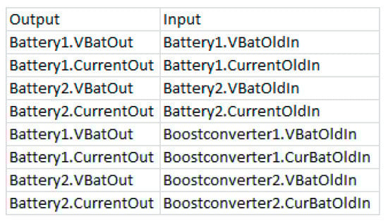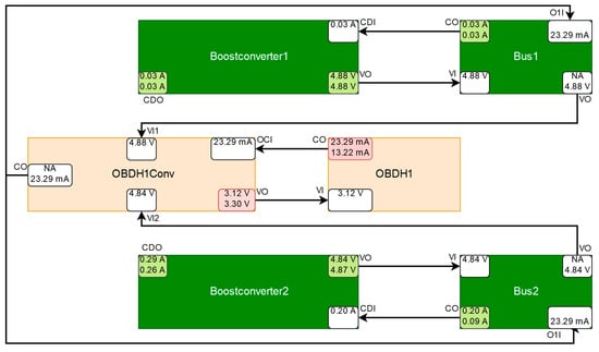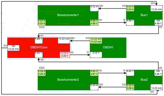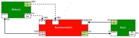 The deterioration of the efficiency of one of the boost converters, Boostconverter2, was simulated to demonstrate the applicability of the model-based fault detection system. The component Boostconverter2 draws a larger current from the power supply than expected. This is detected by a discrepancy at its port CurrentDrawOut (CDO), as depicted in Figure 20, because its tolerance intervals in the component class definition are exceeded (see Section 3.3.1). This discrepancy must be caused either by the Boostconverter itself or by its adjacent components (resp. their neighbor etc.). In this case, Battery2 is an excluded component, since further discrepancies at its other output ports would be expected (e.g. at port VBO in Figure 20). The port CurrentOut (CO) of Battery2 is unsimulatable as it requires measured values from the deactivated solar panels, which are modelled as sensor components and do not produce simulated values. Therefore, the solar panels have no effect on the port CurrentOut (CO) of Battery2 and its output has the same value as CurrentDrawIn (CDI), i.e., the value of CurrentDrawIn is forwarded to CurrentOut. The component Battery2 is an excluded component, as neither of its measured outport values violates a limit and for each of its simulatable outports, there exists a measured and a simulated value, which do not diverge from each other by more than the tolerance intervals defined for the respective port allow. Bus2 cannot cause the discrepancy either, as the values of its port CurrentOut (CO) are correct and Bus2 does not feature any other discrepancies, and therefore is not a symptom component (see Section 3.3.2).