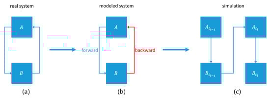 The modelling of a loop. A system containing a loop (a), the model of the system (b) and an illustration of how the model is simulated (c).