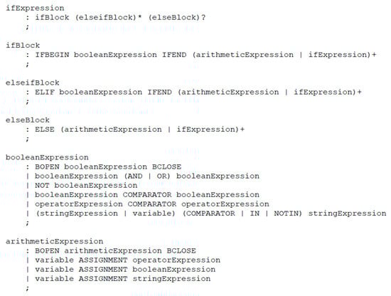 Figure 10 shows an excerpt of the context free ANTLR grammar, used by the parser to analyze the port dependencies. The quantitative expressions of each outport are split into parts, e.g., “ifBlock”, “elseifBlock”, and “elseBlock” consisting of expressions that can be evaluated, e.g., “booleanExpression” and “arithmeticExpression”. The Boolean and arithmetic expressions are evaluated by order of their if-elseif-else parts, while using the data of the current time step. The ports contained in the respective if-elseif-else part to apply first are added to the dynamic port dependencies. This procedure is repeated recursively, as the grammar allows for nesting of expressions. These dynamic port dependencies are later used to limit the number of components that have to be considered during the computation of the conflict sets, as described in Section 3.3.2.