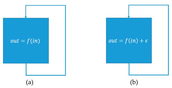 Figure 11 shows the behavior of a hypothetical real technical system on the left and its corresponding model on the right, while assuming the absence of noise. Most models only approximate the real behavior with certain accuracy since it is difficult to capture the behavior of a real technical system perfectly. In this case, the behavior of the real technical system and its model deviate by an error of . For the sake of simplicity, it is assumed that . If the input of the component from Figure 11 is replaced by a measured value each iteration, then the accumulated error per iteration would be . If the simulated value would not be overwritten by the measured value, then after iterations, the accumulated error would be . For a great enough , the modeling error would become so large that no meaningful comparison of the observed and the simulated values could be done, as the accuracy of the model then only depends on the number of simulated time steps, i.e., the number of housekeeping frames.
