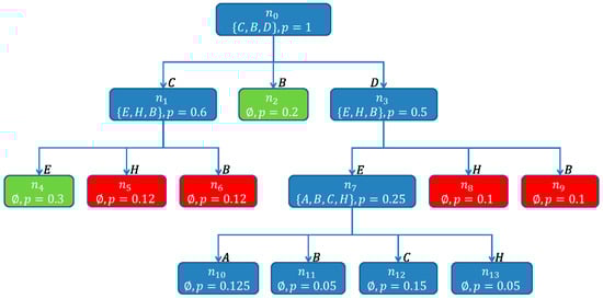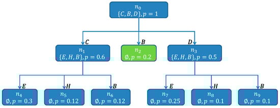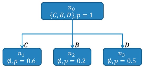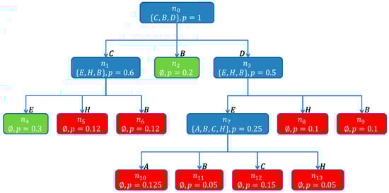 The label of a node is a set of components. The label of an edge is a single component. Each path from the root of the SHSDAG to a node, labeled as , is a minimal hitting set. The score for a path is calculated by multiplying the a priori failure probabilities or when available the suspicion scores of each component . These scores have the character of a pseudo probability. To reduce the size of the SHSDAG and to ensure that only minimal hitting sets are being computed, additional to the algorithm above, the following node-reuse and node-termination rules are being used.