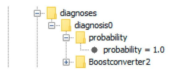 There exists one single diagnosis, containing the boost converter for which a fault was induced, as can be seen in Figure 22. The diagnosis has a score of 1.0, given by a relative pseudo probability, here simply denoted as probability.