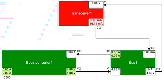 Simplified schematic depiction of the suspected component Boostconverter2 in red together with its adjacent components (not suspected, therefore in green), taken over from the satellite model from Figure 19 with relevant ports (boxes within the components with their abbreviated names above the boxes, e.g., VBO) and relevant port values (values within the port boxes if available, top value: measured, bottom value: simulated). Forward connections are depicted by solid arrows, backward connections by dotted lines. Comparisons between measured and simulated values are performed at the output ports (denoted with an outgoing arrow; if an output value is not available, it is denoted with “NA”; the port box color denotes red for detected discrepancies, green for correct and white for unknown). Input ports are white, because they do not compute discrepancies, and use measured values if available, otherwise simulated values.
