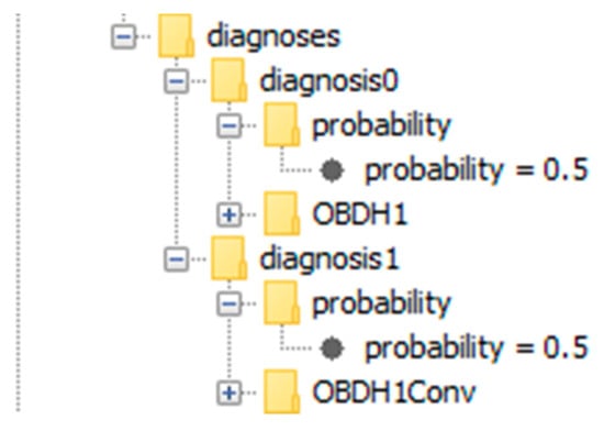 The two diagnoses contained in the diagnosis.xml-file. The first diagnosis is the malfunction of OBDH1 and the second diagnosis is the malfunction of OBDH1Conv. Both diagnoses have the same probability (probability = 0.5), because OBDH1 and OBDH1Conv have the same a priori failure probability (modeled in the component class definitions) and both can explain all observed discrepancies.