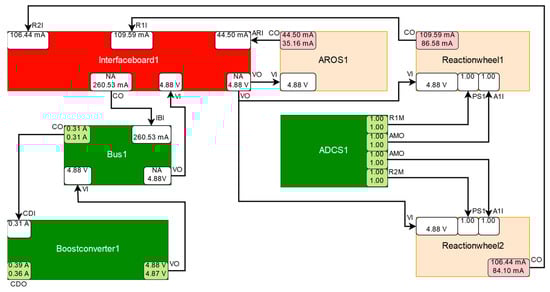 For the next experiment, a malfunction of Interfaceboard1 with turned on ADCS1, AROS1, Reactionhweel1, and Reactionwheel2 components was simulated. The malfunction causes the supply voltage to abnormally drop at Interfaceboard1, which in turn leads to an increase in the current drawn by the consumers connected to it. This causes a discrepancy at the port CurrentOut (CO) of AROS1, at the port CurrentOut (CO) of Reactionhweel1 and at the port CurrentOut (CO) of Reactionhweel2, as can be seen in Figure 28. As Interfaceboard1 is not directly measured, no discrepancy can be detected at Interfaceboard1 and no symptom can be generated for it. A malfunction of Interfaceboard1 can only be detected by observing the deviation of the observed behavior of the connected consumers from their expected behavior. The consumers that may be affected by a malfunction of Interfaceboard1 are Reactionhweel1, Reactionhweel2, AROS1, and the ASAP payload (not depicted because it is turned off). However, if abnormal behavior is observed at these components, then a malfunction of Interfaceboard1 is just one of multiple possible causes. Since all of the components are connected to the power supply via a bus, a malfunction of the power supply is also a viable candidate. Additionally, the reaction wheels are controlled by both ADCS systems, ADCS1 and ADCS2 (not depicted because it is turned off), which makes them a candidate to cause abnormal behaviour that is associated with the reaction wheels. The simplest explanation for a malfunction of the payloads is that the payloads themselves are malfunctioning. However, this becomes less likely, the more payloads are simultaneously malfunctioning. As ASAP is turned off, it has no effect on the remaining system. Each ADCS system is able to control all of the reaction wheels and therefore has a connection to each of them, but only one ADCS system is active at a time. as ADCS2 is turned off, the dynamic port dependencies do not include connections to ADCS2. Therefore, ADCS2 is not considered. The components Boostconverter1 and ADCS1 are excluded components, since there exist measured and simulated values for all of their output ports, which do not deviate from each other more than allowed by their respective tolerance intervals and no measured value violates a threshold limit. The remaining components that can cause the observed discrepancies are AROS1, Reactionwheel1, Reactionhweel2, Interfaceboard1, and Bus1. Bus1 is relieved by other consumers, including ADCS1 via the ADCS1Conv component (not depicted due to readability reasons) and deemed to be not suspicious. Interfaceboard1 is relieved by Boostconverter1, but, as it is suspected by all symptom components, Interfaceboard1 is found to be malfunctioning.