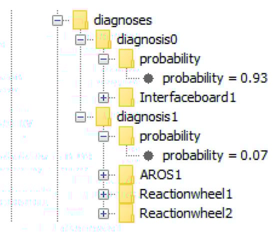The two diagnoses listed in the diagnosis.xml-file. The first diagnosis only contains Interfaceboard1 and has a probability of 0.93 and the second diagnosis consists of AROS1, Reactionwheel1, as well as Reactionwheel2 and it has a probability of 0.07.