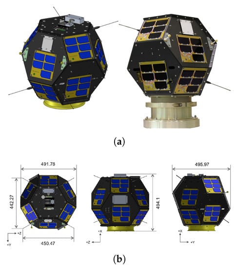 Ten-Koh satellite flight model configuration once in orbit. The black external structure is made of CFRP. (a) Computer-aided design rendering on the left, flight model photograph on the right. (b) The envelope allowed by the launch vehicle was 500 mm × 500 mm × 500 mm.