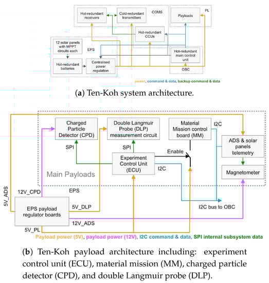 Block diagrams of the Ten-Koh system as well as its payloads. Dashed lines show the limit of each subsystem and the solid lines indicate the type of interface. Ten-Koh satellite uses I2C as the main data bus (blue), and SPI (gray) as a backup data bus and direct interface with sensors inside every subsystem. The 5 V power lines are shown in yellow and the 12 V lines in magenta. The ADS subsystem was included inside the payload subsystems (PL) for convenience in the physical location inside the satellite, hence it appears in the bottom block diagram.