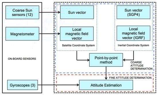 The attitude determination subsystem philosophy is outlined in Figure 3. Raw measurements from coarse sun-sensors, gyroscopes and magnetometer are processed on-ground in order to estimate the attitude. Because attitude control has not been implemented, attitude determination on-board was not required, which further simplified the on-board software.