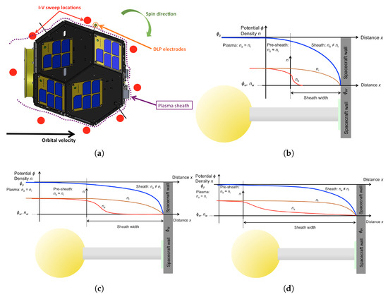 Representation of the DLP measuring system: (a) I–V (current–voltage) sweep locations around a spinning spacecraft; and (b–d) 1-D model representing the electrodes inside and outside of the plasma sheath.