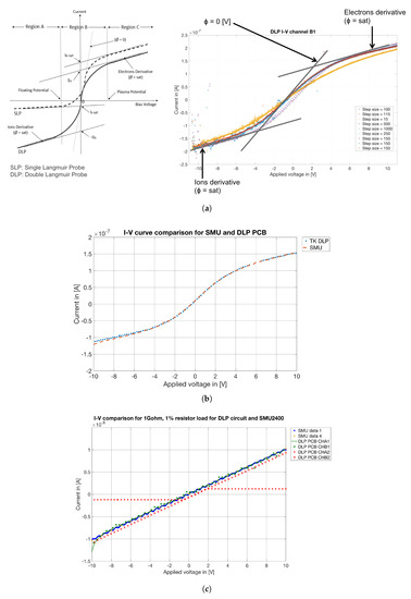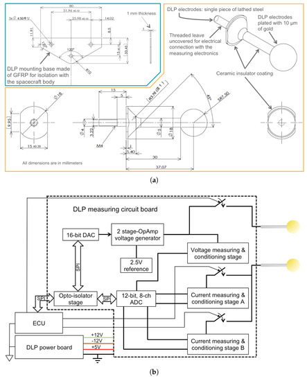 The DLP system is composed of two spherical, 10 m gold-plated electrodes, as shown in Figure 5a, which are placed outside of the spacecraft structure. The electrodes are mounted on an isolating glass fiber reinforced polymer (GFRP) plate to avoid any electrical contact with the CFRP structure, thus keep the electrodes floating with respect to the spacecraft ground. The shafts supporting the spheres are coated with alumina to ensure that only the spheres attract plasma particles, thus making the interpretation of results easier. The DLP control circuit, housed inside the spacecraft, uses a 16-bit digital-to-analog converter (DAC) to generate the DC biasing voltage. This allows the sweep duration to be tailored such that the plasma in different locations around the spinning spacecraft can be characterized, as shown in Figure 4a,b and Figure 5a,b. The current flowing between the probes through the plasma and the biasing voltage are measured with a AD7927 12-bit ADC. The measurement circuit is isolated from the common ground of the spacecraft, which enables the plasma parameters to be measured.