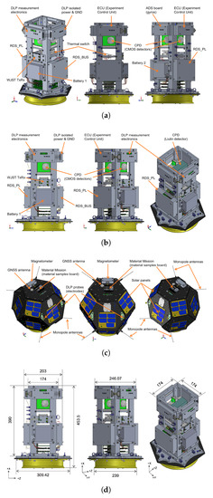 The payload arrangement onboard the spacecraft: external arrangement (a); internal arrangement (b,c); and internal structure dimensions in millimeters (d).