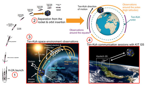 In recent years, different missions have been launched to explore the near-Earth region in order to provide direct measurements of charged particles, plasma, and the magnetosphere. Missions such as the Van Allen Probes (RBSP) [6,7], THEMIS [8], MMS [9] from NASA, JAXA’s ERG (ARASE) satellite [10], Proba-2 [11] and Swarm [12] from ESA have been launched into specific orbits to study space radiation around the Earth [13]. In addition to the mentioned missions with launch masses of hundreds of kilograms, dedicated small satellites offer an important complement to the measurements because they enable a wider, more comprehensive view of the space environment thanks to their reduced development time and cost. This class of satellites leverages commercial off-the-shelf (COTS) components to bring cost and time savings at the expense of an increased risk of failure. The small-satellite Ten-Koh has been developed to demonstrate the feasibility of providing space environment measurements with such low-cost platforms, as well as to provide readily usable data.