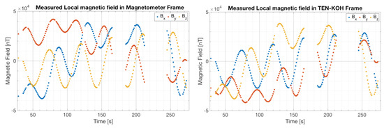 - Reyes, R.; Faizullin, D.; Fajardo, I.; Hiraki, K.; Okuyama, K. Nano-satellite TEN-KOH Attitude Determination Subsystem: Architecture and Initial In-orbit Results. In Proceedings of the 32nd International Symposium on Space Technology and Science & 9th Nano-Satellite Symposium, Fukui, Japan, 15–21 June 2019. [Google Scholar]